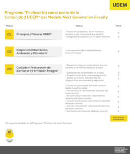 La temática del programa de capacitación, corresponde al componente Profesor como parte de la Comunidad UDEM, del Modelo Next Generation Faculty.