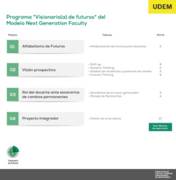Este es el último programa que anunciamos para tener el 100% de la oferta de la formación del Modelo Next Generation Faculty, próximamente les tendremos noticias sobre el calendario de capacitación de este y los anteriores programas que lanzamos recientemente: “Profesor(a) como parte de la Comunidad UDEM” y “Visionario(a) de futuros”.