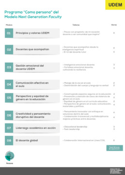 El programa “Profesor(a) como Persona”, está diseñado para formar docentes capaces de acompañar y enriquecer talentos, y se encuentra alineado al Modelo Next Generation Faculty. El programa impulsa el desarrollo integral y promueve un perfil docente auténtico, empático, dinámico y transformador y fortalece habilidades como liderazgo, comunicación, tutoría, pensamiento crítico y apertura global, en un entorno que valora la inclusión, la creatividad y el trabajo colaborativo en el aula.